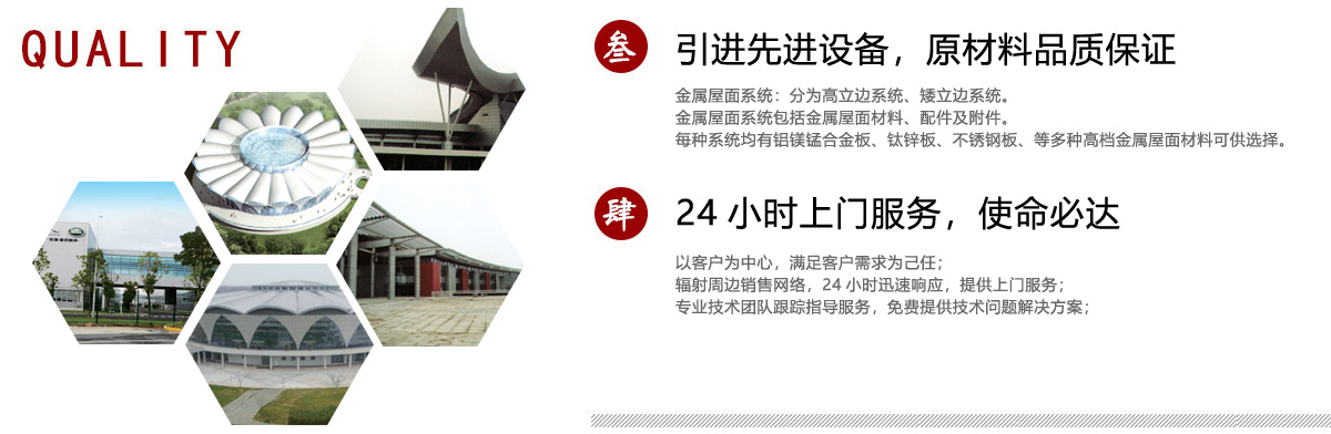 金屬屋面系統:分為高立邊系統、矮立邊系統。金屬屋面系統包括金屬屋面材料、配件及附件。每種系統均有鋁鎂錳合金板、鈦鋅板、不銹鋼板、等多種高檔金屬屋面材料可供選擇。